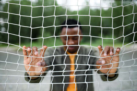 Frustrated young black man behind net outdoors in city, black lives matter concept.
