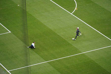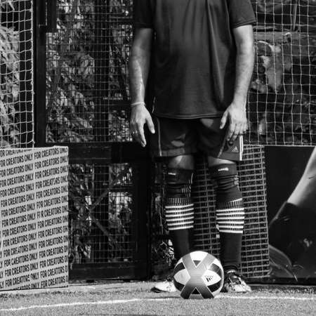 Kyiv, Ukraine - August 17, 2019 soccer ball with his feet on the football field