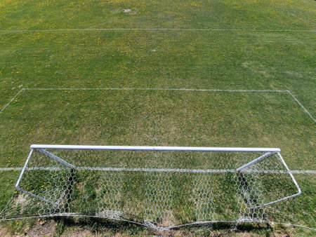 Soccer Ground Detail. Outdoor sport ground with green surface for playing football or soccer in urban area, detail, drone view