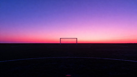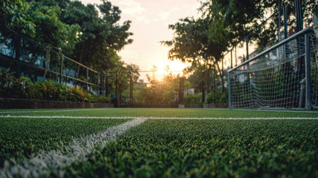 A serene sunset casts a warm glow over a vibrant artificial turf soccer field, inviting players to enjoy the beauty of sport amidst lush greenery and urban scenery.