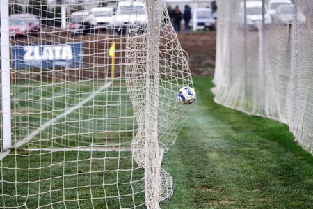 Soccer ball kicked into the goal with a powerful shot during an intense soccer match