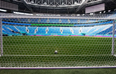 beautiful view of a modern football stadium. Soccer ball on soccer field.