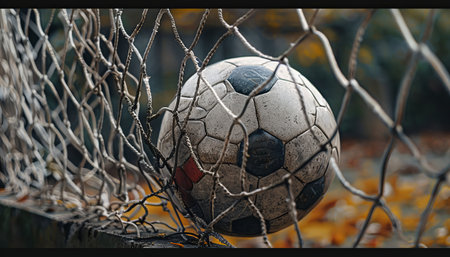 worn soccer ball rests on grass, with a blurred goalpost in the background, surrounded by autumn leaves