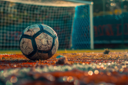 A soccer ball is sitting on the ground next to a goal. The ball is dirty and has a worn appearance. The scene suggests a casual, relaxed atmosphere, perhaps during a friendly game or practice session