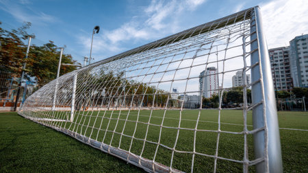 A vibrant soccer goal frames a lush green turf field, complemented by a clear sky and modern urban buildings in the background. Ideal for sports themes.