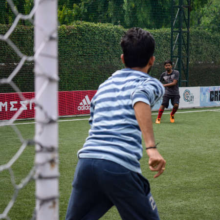 New Delhi, India - July 01 2018: Footballers of local football team during game in regional Derby championship on a bad football pitch. Hot moment of football match on grass green field of the stadium