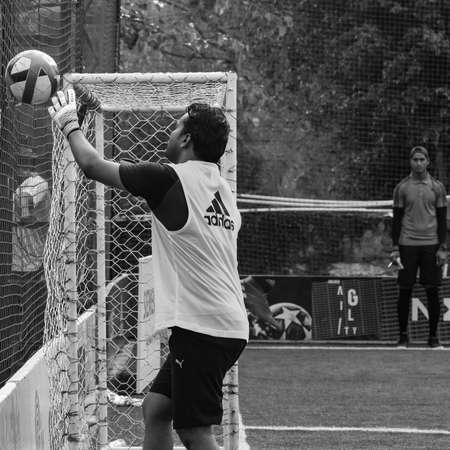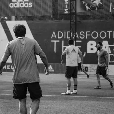 Delhi, India - July 19 2019: Footballers of local football team during game in regional Derby championship on a bad football pitch. Hot moment of football match on field of stadium – Black and White