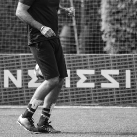 Marbella - January 17, 2020: The player kicking the ball on the football field