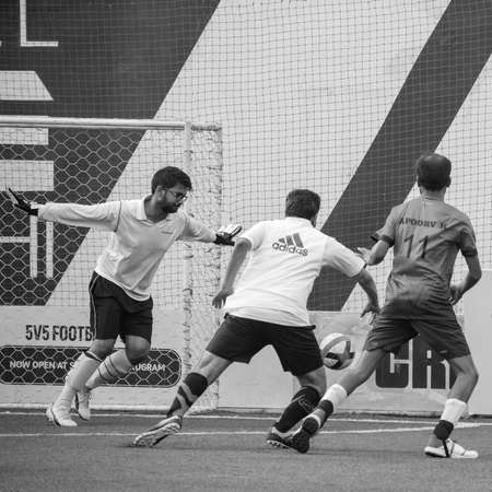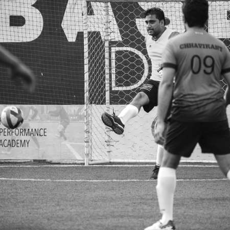 Delhi, India - July 01 2018: Footballers of local football team during game in regional Derby championship on a bad football pitch. Hot moment of football match on field of stadium – Black and White