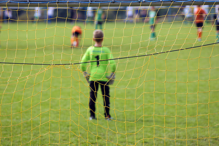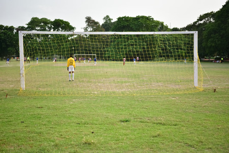 Football training for children, the goalkeeper got ready to defend him from the ball that was just sent. in the background the field and children.