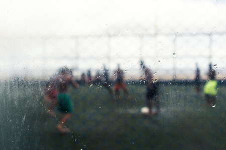 Wet glass, inside car view of people playing ball. Salvador, Bahia, Brazil.