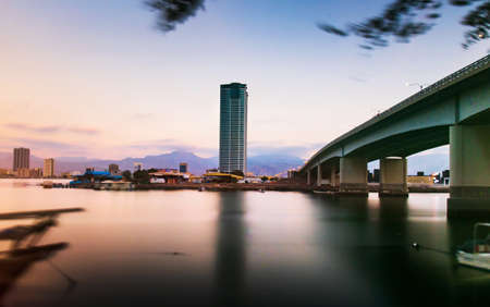 View of the longest bridge in Malaysia at sunrise in the sun. The bridge connects Penang and the mainland