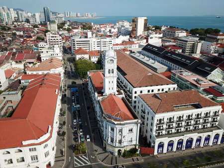 Georgetown, Penang/Malaysia - Feb 28 2020: Aerial view clock tower Wisma KASTAM.