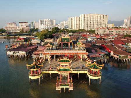 Georgetown, Penang/Malaysia - Feb 29 2020: Aerial view floating temple Hean Boo Thean build on sea.