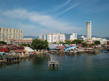 Georgetown, Penang/Malaysia - Feb 28 2020: Aerial view wooden stilt house at sea near UNESCO World Heritage site Gaeorgetown