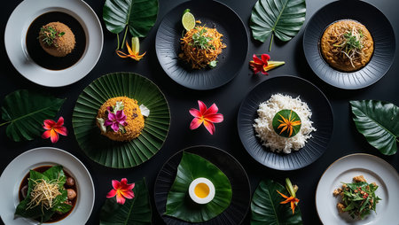 A stunning overhead view of a Thai feast, showcasing a variety of colorful dishes such as Som Tum, Pad Krapow, and mango sticky rice, perfect for celebrating a special occasion.