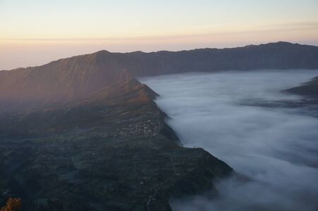 Mist flowing over Cemoro Lawang village in the morning located to northeast of Mt Bromo, Indonesia