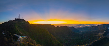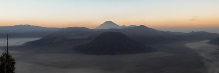 Panorama Bromo . Mount Bromo volcano during sunrise from viewpoint. Mount Bromo is an active volcano and one of the most visited tourist attractions in East Java, Indonesia.