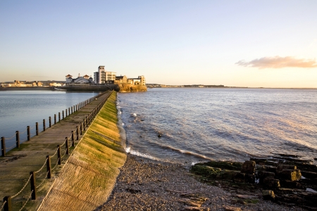 Aerial view of Penarth and the Cardiff Barrage leading out onto the Bristol Channel