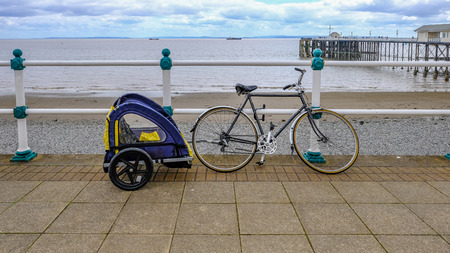 Bike with child cycle buggie, secured to railing on the sea front. Shows beach and sea and pier in the background.