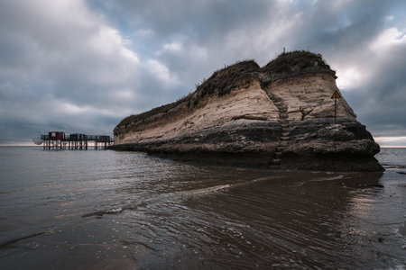 Sunset seascape along the coastline with traditional carrelets in Charente-Maritime in France