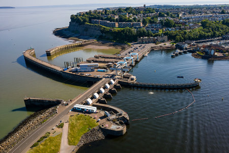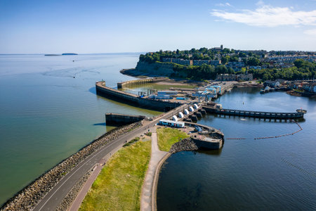 Aerial view of the Cardiff Bay lagoon, barrage and Bristol Channel near the village of Penarth