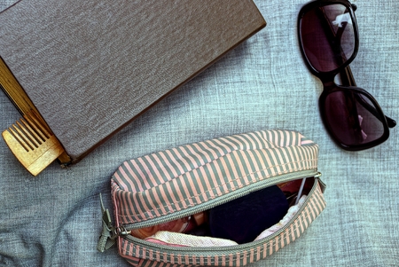 Orange cosmetic bag on a white table. Soft focus. Toned.