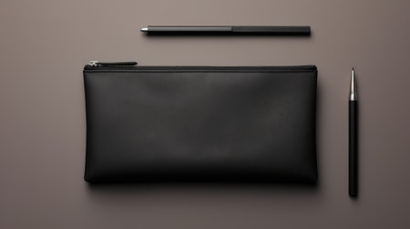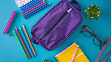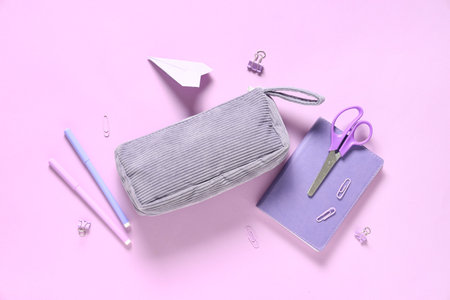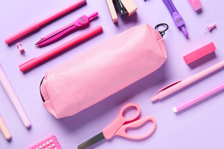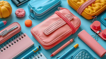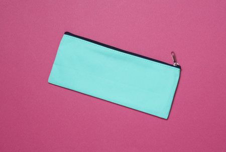 A vibrant pink pencil case laid on a sleek desk, accompanied by a blue pencil and other stationery items. Perfect for school or office settings.