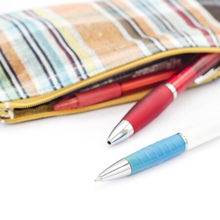 Organized pencil case with neatly arranged pens, markers, rulers, and correction tape on a tidy workspace