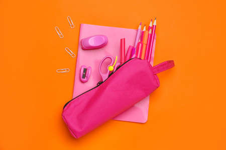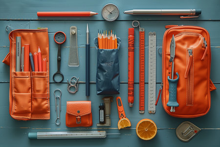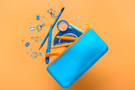 Orange Pencil Case and Assorted Stationery on Blue Wooden Table