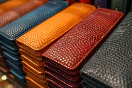 Vibrantly colored leather wallets neatly arranged in a row, showcasing the texture and craftsmanship. ideal for stylish organization and perfect as thoughtful gifts. highlights premium quality, vibrant colors, and fine texture. Generative AI