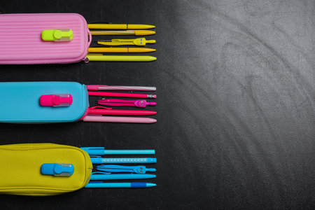 Blue and Orange Pencil Cases With School Supplies on Blue Background