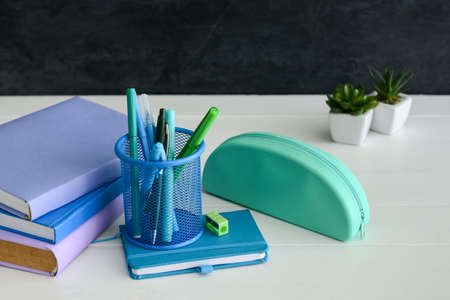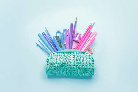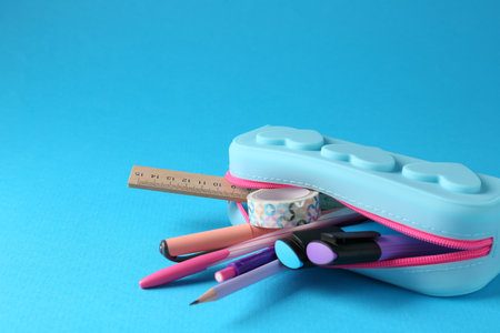 Different stationery in pencil case on light blue background, closeup. Space for text