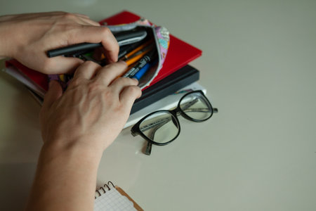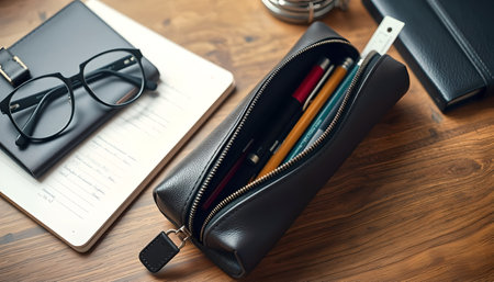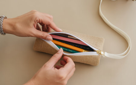 Zipped open pencil case revealing organized school supplies like pens, erasers, and sharpeners, neutral background, tidy and prepared back to school concept