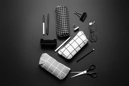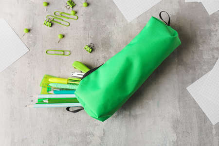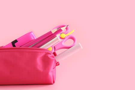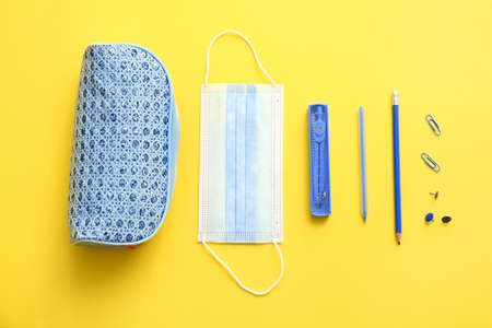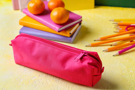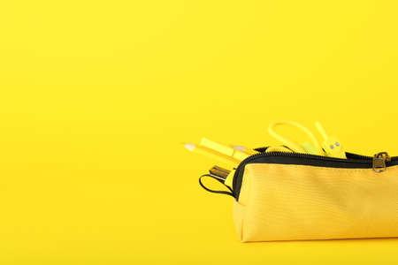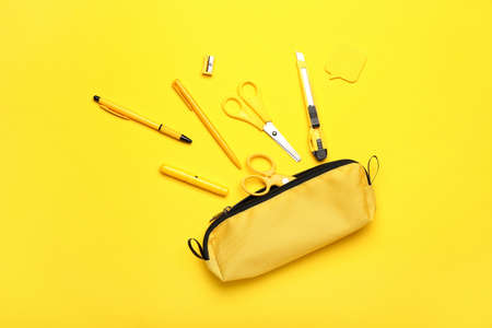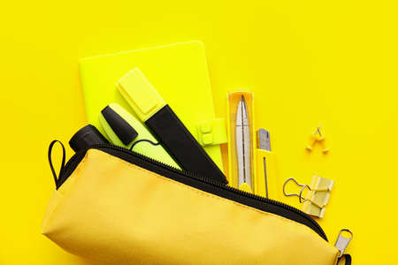 Pencil case with school stationery on a yellow background. Top view. Flat lay. Back to school concept.