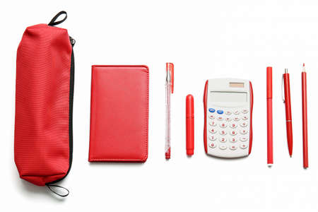 Colored pencils rainbow. School pencil case. White background. Back to school. Flat lay. Copy space