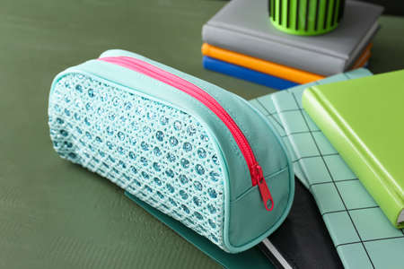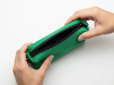 The image features a green pencil case with a zipper being held by two hands. The pencil case is isolated on a white background, making it the focal point of the image. This image is ideal for educational or stationery-related content.