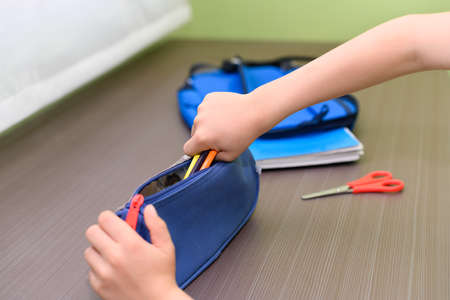 A child's hands holding some colored paints in a blue case for school. On a table is a backpack, a notebook and scissors. Back to school concept