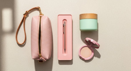A stylish flat lay of pink makeup pouch, brushes in a case, a green jar of cream, and a compact powder, perfect for beauty content.