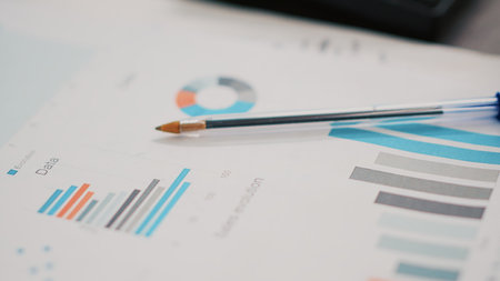 Business paperwork on office desk next to cup of coffee, extreme close up shot. Company documents containing charts and hot beverage on table in financial department workspace
