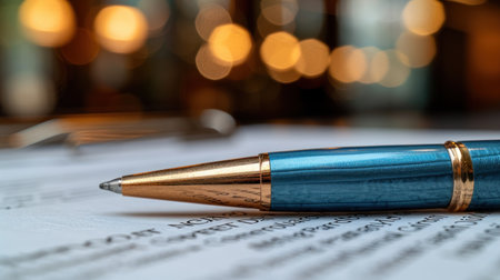 A beautiful blue pen lies on neatly arranged papers surrounded by warm, ambient light.