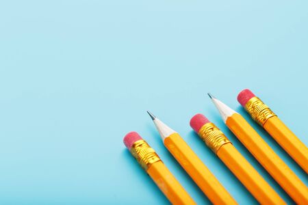 Business concept - lot of same pencils and one different pencil on yellow paper background. Copy paste.