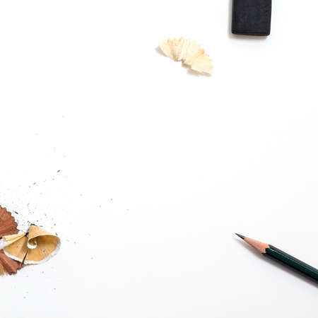 Background with white paper, pencils and eraser. Workplace for the painter. Background to display the logo and lettering. copyspace, space for text. the blogger instrument.