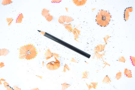 Black color wood pencil crayon placed beside some scattered normal pencil shavings