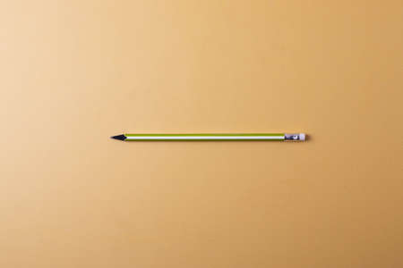 A diagonal row of penciils sit on a neutral table. Focus on one pencil. Copy space.