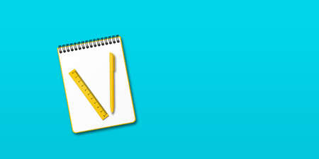 Opened yellow notebook and yellow ball-point pen and ruler, turquoise blue background with copy space for your image or text. Minimalist vector illustration as back to school. Top view, flat lay.