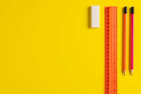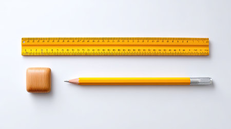 This image features bright yellow office supplies, including a ruler, pencil, and eraser, arranged on a clean white background, perfect for educational and creative projects.