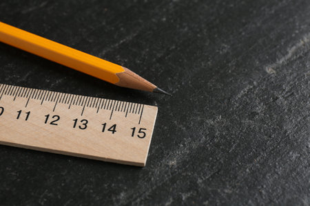 Wooden ruler and pencil on black table, closeup. Space for text
