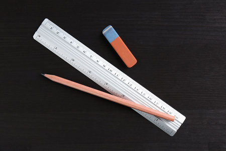 Ruler, pencil and eraser on black wooden table, flat lay
