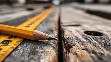A close-up image showcasing a yellow pencil beside a ruler on a weathered wooden surface, highlighting the textures and details, ideal for crafting and design projects.